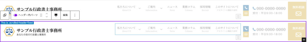 どちらも同じ内容のため、「ヘッダー内パーツ」という名前でテンプレートパーツとして共通化しており、編集は1か所だけで済みます。